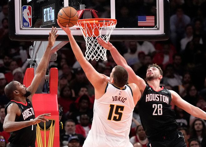 火箭主场迎战掘金,火箭缺少了范弗利特、伊森、芬尼史密斯,掘金缺少了布劳恩,比赛刚开打3分钟,掘金大将戈登腿筋拉伤退出比赛,掘金少了戈登后没有慌乱,他们首节取得13分领先,第二节谢泼德单节18分帮助火箭反超3分,第三节约基奇单节18分带领掘金重新领先2分。第四节还剩23秒时掘金领先6分,火箭在还剩6秒时把分差追到1分,约基奇2罚2中后申京超远三分不中,掘金3分优势击败火箭。约基奇20中11(三分8中4)得到34分10板9助2断,穆雷16中10得到26分2板10助,火箭方面谢泼德13中9(三分8中5)得到27分4助2断,阿门18中10得到22分7板2助2断。