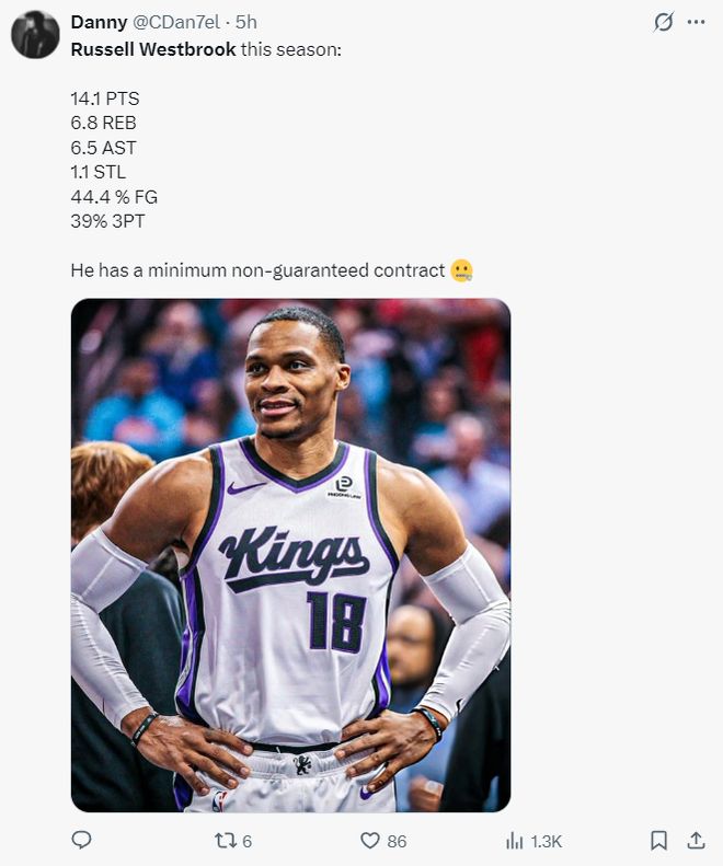 本赛季的国王总薪资高达2.1亿美元,拉文4749万、小萨4233万、德罗赞2475万、蒙克179万,而威少是拿着不保障底薪360万,如今少爷成为了这支国王的大腿?